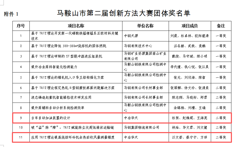 项目《应用TRIZ理论提高烧结环冷机余热回收风量测量精度》由工业环境能源分公司组织完成申报,江文豪、蔡宁宁、方田三位选手参赛;项目《台车自动加油装置的设计》由钢铁设计研究总院组织完成申报,杜预、赵维超、王海亮三位选手参赛。比赛中,选手们克服首次参赛的紧张情绪,持续完成作品申报、反复打磨答辩材料、努力学习答辩技巧、熟练掌握理论知识,开拓创新思维,应用创新方法,个人技能水平不断提升,形成了强大的团队合力。